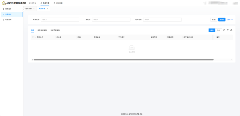 - · 【自荐专家审核】,显示待单位推荐的专家信息;