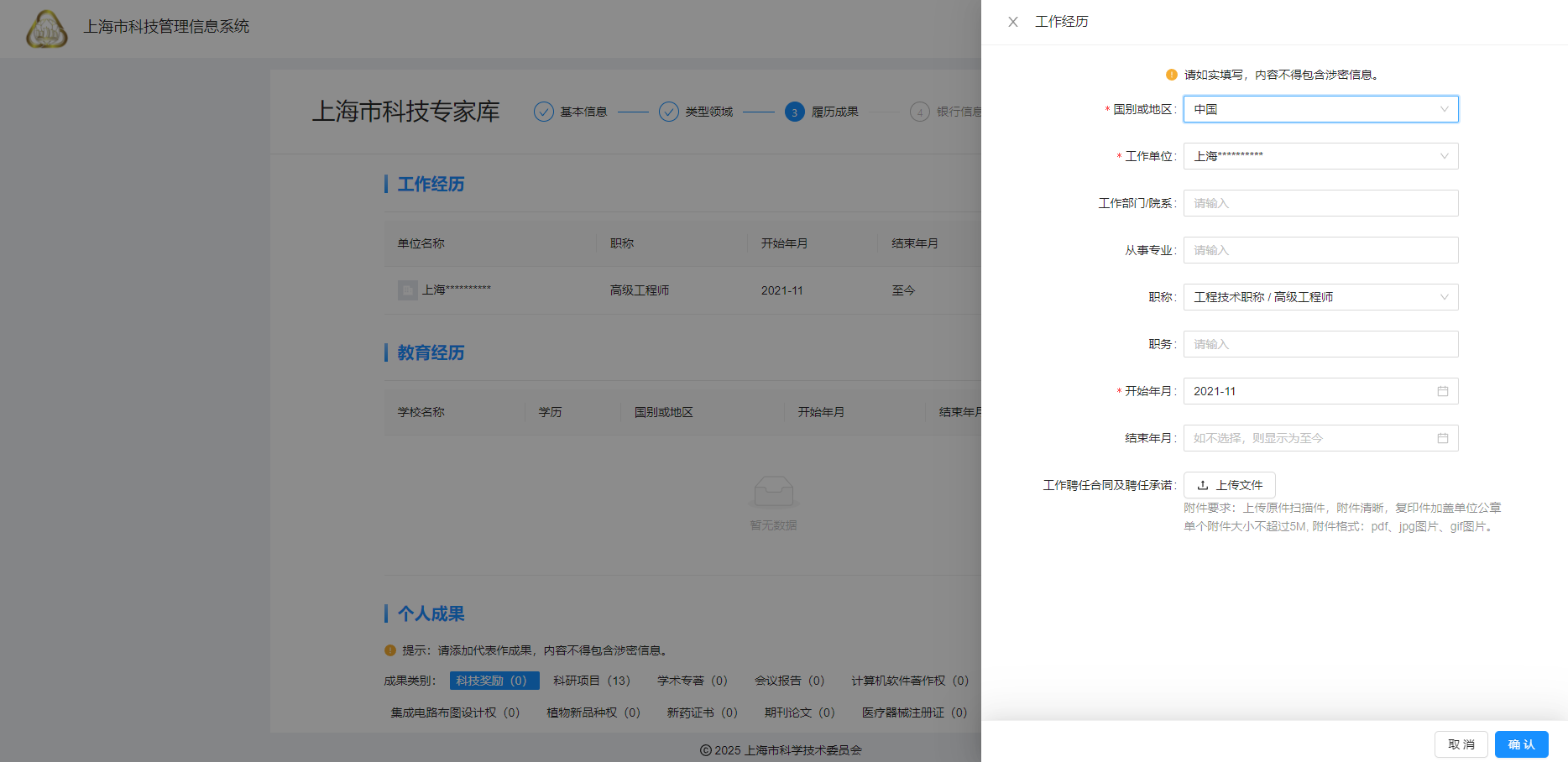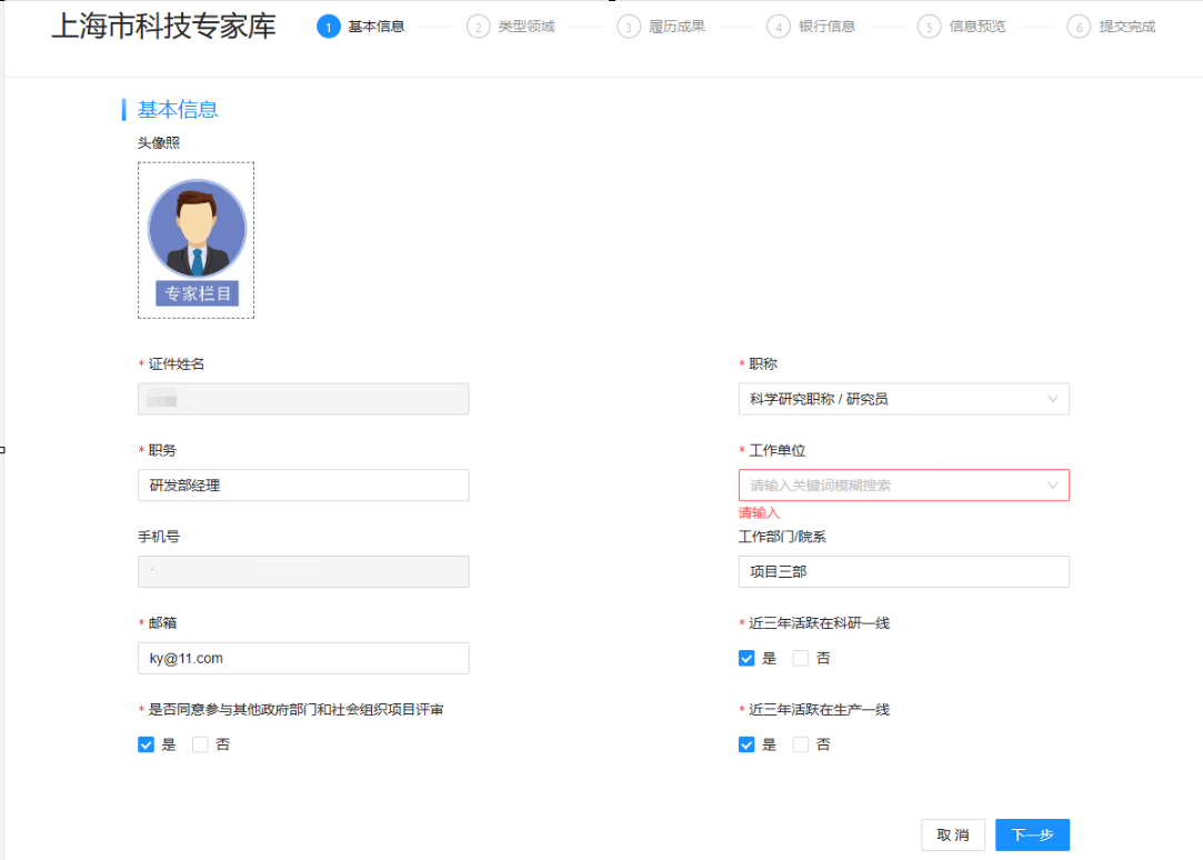 专家更新工作单位、专家类型、职称、专长领域等信息,需所在工作单位审核,经公示无异议或者异议不成立后生效。专家更新个人联系信息、银行卡信息,补充科研成果等信息,无需所在工作单位审核。