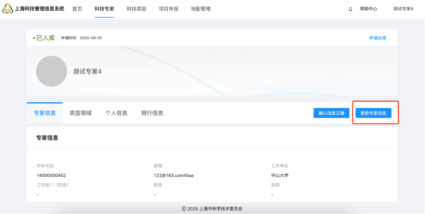2. 点击【科技专家】,进入上海市科技专家库专家信息页面。