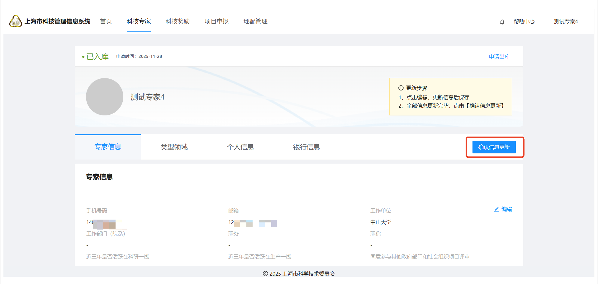 - 2. 如需调整信息,点击【更新专家信息】按钮进入专家更新页面,点击【编辑】修改信息,然后点击【保存】,全部修改完毕后点击【确认信息更新】,专家信息更新完成。